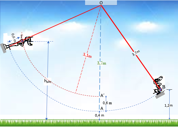 Έστω ότι το κέντρο μάζας (σημείο B) ενός παιδιού, που κάθεται πατώντας με λυγισμένα τα γόνατα σε μια ελαφριά κούνια, βρίσκεται σε ύψος 1,2 m πάνω από το έδαφος. Το βάρος του παιδιού είναι 400 Ν και το κέντρο μάζας του, με λυγισμένα τα γόνατα, απέχει 3,7 m από τον άξονα περιστροφής της κούνιας, ο οποίος διέρχεται από το σημείο Ο. Η κούνια μαζί με το παιδί αφήνονται από την ηρεμία, και όταν το κέντρο μάζας φτάσει στο χαμηλότερο σημείο Α της τροχιάς του το παιδί σηκώνεται ξαφνικά όρθιο, ανεβάζοντας έτσι το κέντρο μάζας του από τη θέση Α στην θέση Α΄, κατά 0,6 m ψηλότερα. Να βρείτε: