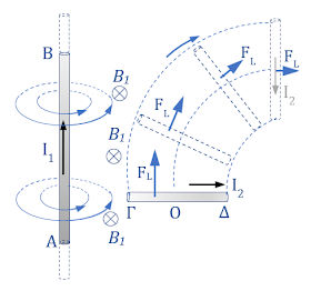 Η κατεύθυνση της κίνησης κάθε στοιχειώδους τμήματος του αγωγού ΓΔ μπορεί να βρεθεί από τον κανόνα του δεξιού χεριού. Δεδομένου ότι ο αγωγός είναι ομοιόμορφος, το κέντρο βάρους του θα βρίσκεται στο O. Η ένταση του μαγνητικού πεδίου στο σημείο Γ θα είναι μεγαλύτερη από αυτή στο σημείο Δ, σύμφωνα με τον τύπο: Β = kμ2πΙ/R, (όπου R η απόσταση από τον ΑΒ).